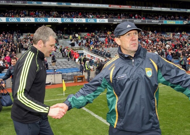 Mayo boss James Horan and Kerry counterpart Jack O’Connor shake hands after the game. Pic: INPHO/Ryan Byrne