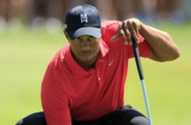 Tiger Woods lines up a putt on the second green. (AP Photo/John Raoux)