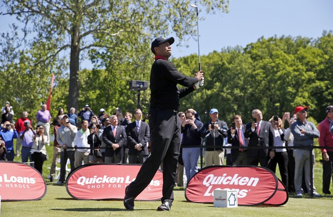 Tiger Woods watches the first of three ceremonial balls from the 10th tee during a Quicken Loans National golf tournament media availability at Congressional Country Club. Alex Brandon