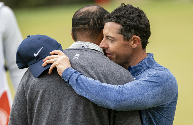 Woods and McIlroy on the sixth hole during the fourth round on Saturday. SIPA USA / PA Images