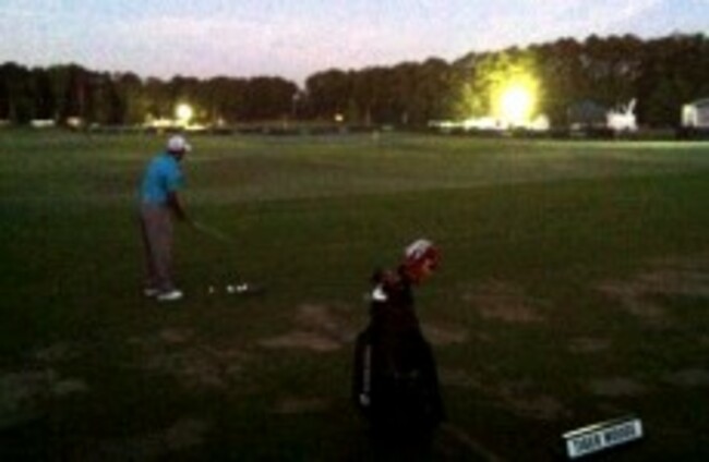 Woods is preparing for the PGA Championship which beings tomorrow. You can interpret this is a man so devoted to winning that he got up before any of his competitors to get the jump on the day. Or as a solitary tragic figure on a lonely epic quest after being abandoned by all his friends.