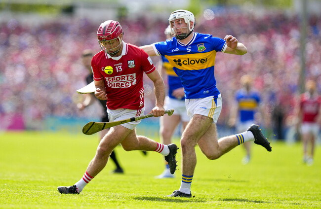 Darragh Fitzgibbon of Cork is closely watched by Robert Doyle of Tipperary. James Lawlor / INPHO
