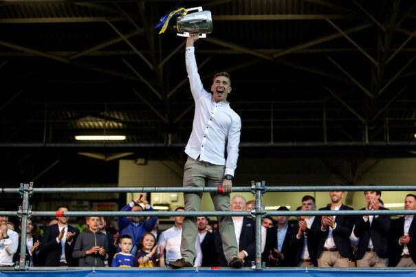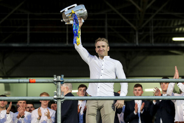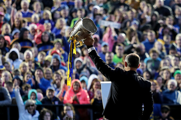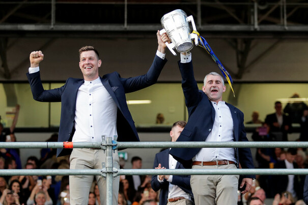 Seamus Callanan and manager Liam Sheedy bring out the trophy