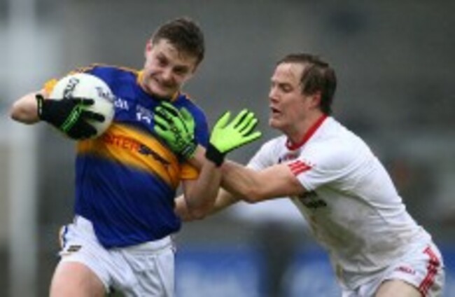 Tipperary's Colin O'Riordan is tackled by Tyrone's Frank Burns. Cathal Noonan / INPHO