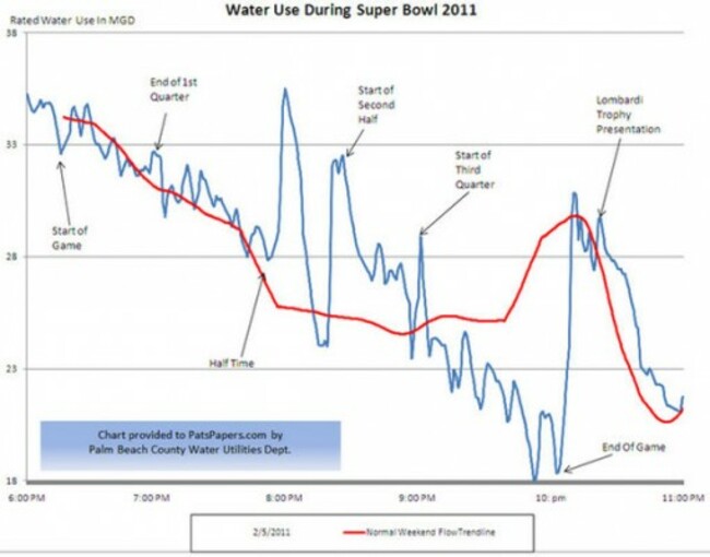 The data comes from the water company in Palm Beach County, Florida. They tracked minute-by-minute usage of water consumption and were able to peg huge spikes to key moments in the game, like halftime and commercial breaks. (The red line charts an average Sunday Night.)
