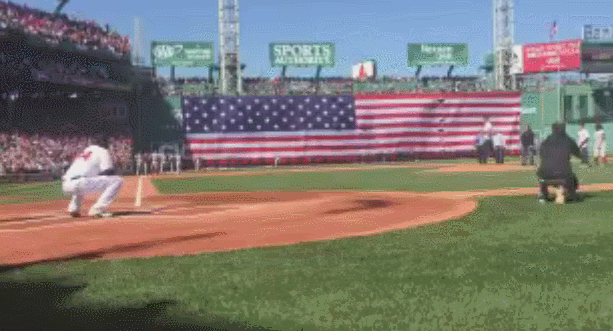 While Brady’s is far from the worst we’ve ever seen — take a bow 50 Cent — he fails to reach David Ortiz behind home plate as the ball bounces along in the dirt: