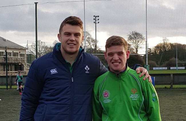 Connacht centre Tom Farrell alongside Stephen Lee, who will represent Ireland at the Special Olympics in Abu Dhabi next month. Jennifer Lee, Coolmine RFC