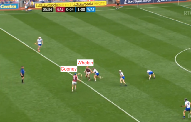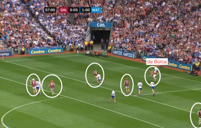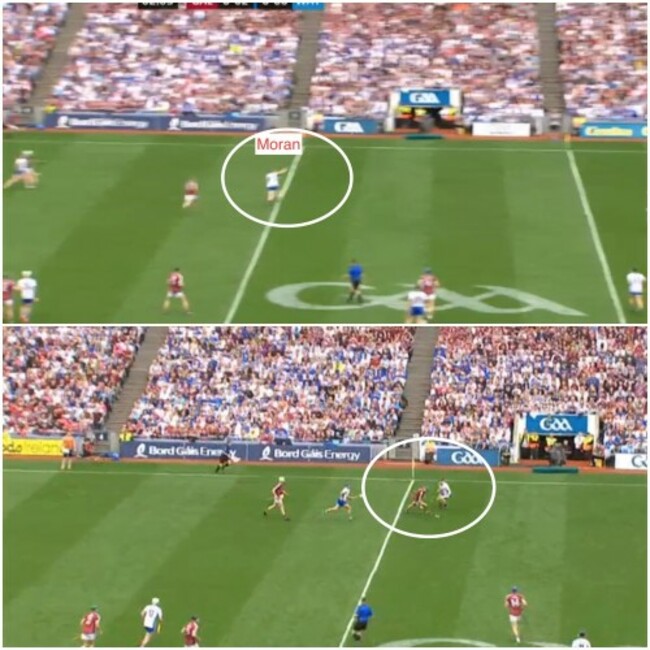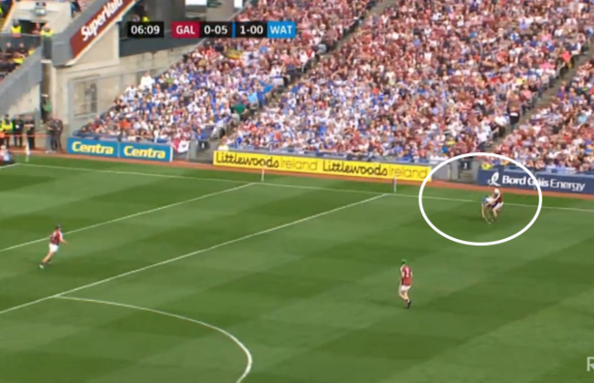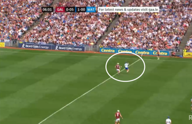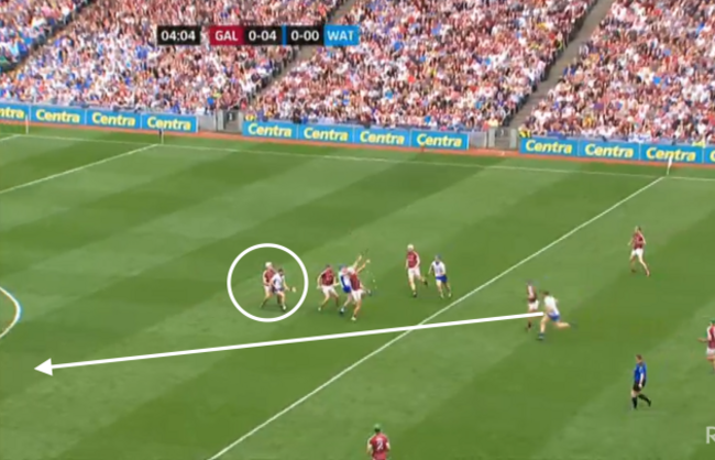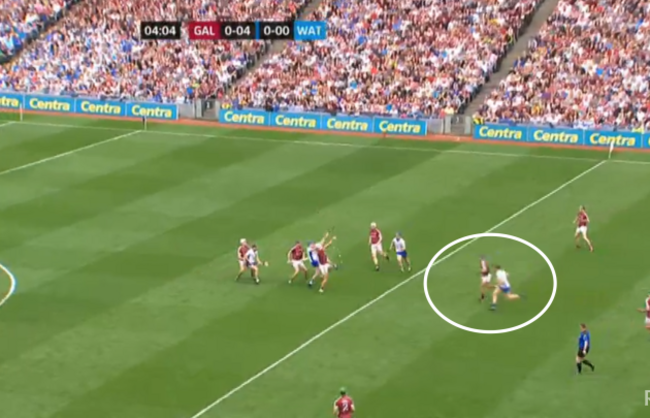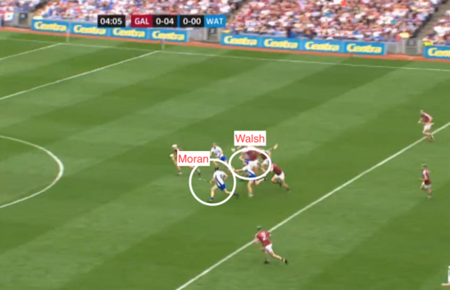 At four minutes and four seconds, I’ve frozen the frame and you can see how Galway have gone man on man, with Waterford really pushing up on them. But have a look at the eventual goal-scorer, Kevin Moran, who I’ve circled: