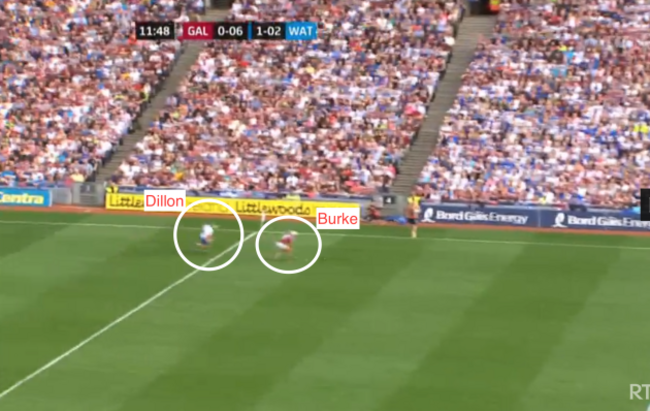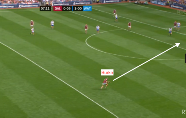 Looking at the shot again, Daithi Burke (circled) is the last Galway defender, and the arrow indicates the area that Moran is going to run into: