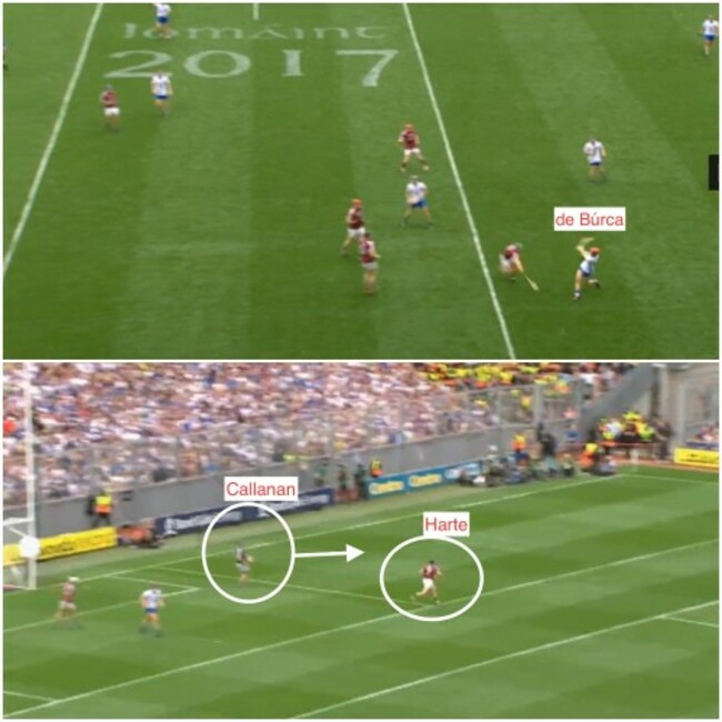The point is that the Waterford support players were very slow in getting there, and that’s unusual for them, but Galway had played it much smarter in the previous example which culminated in Conor Cooney’s point.