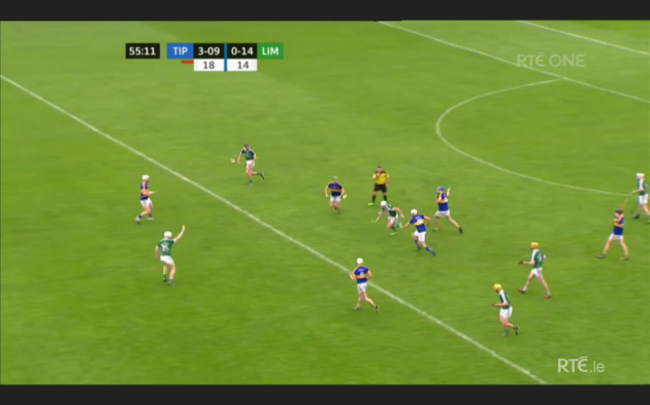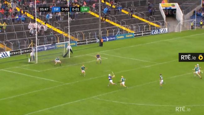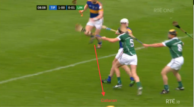 Limerick are now in all sorts of bother and rookie full-back Dan Morrissey has a decision to make. He’s drawn towards the ball and that leaves Seamus Callanan free in behind.