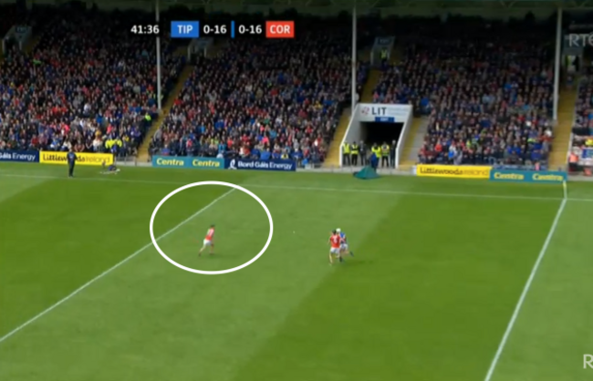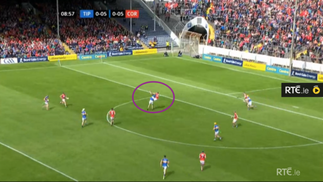 From a long Pádraic Maher clearance, Mark Coleman (circled) is perfectly placed, in that covering position, to pick up the ball: