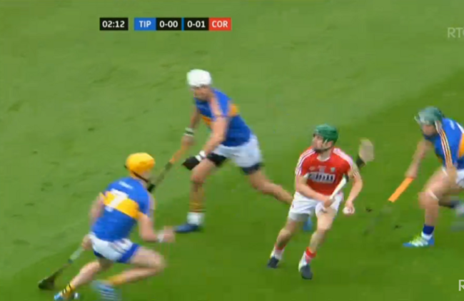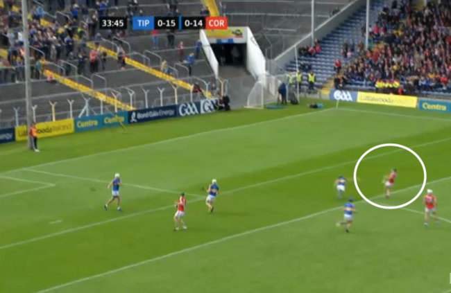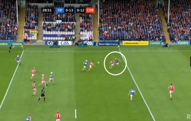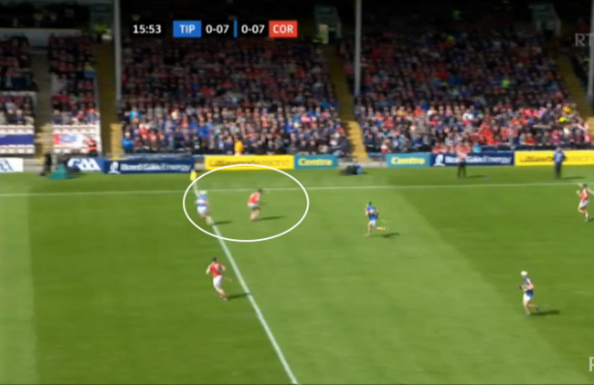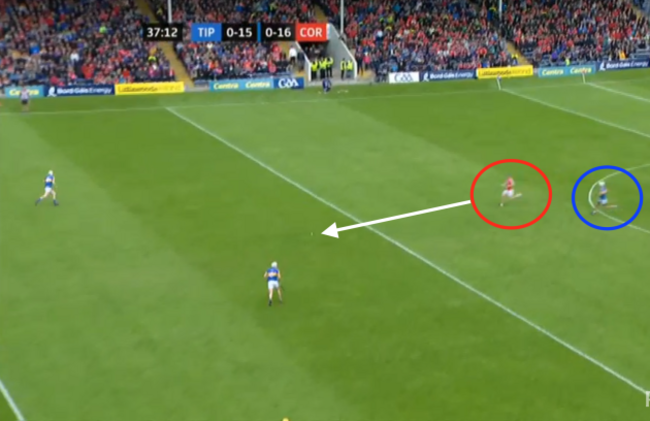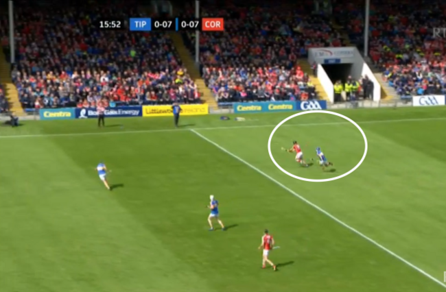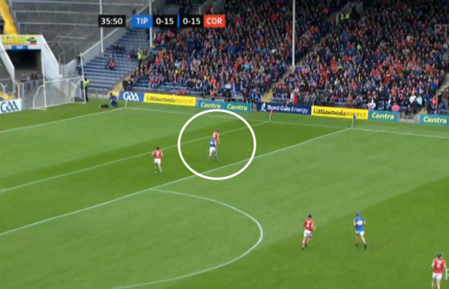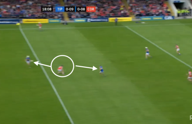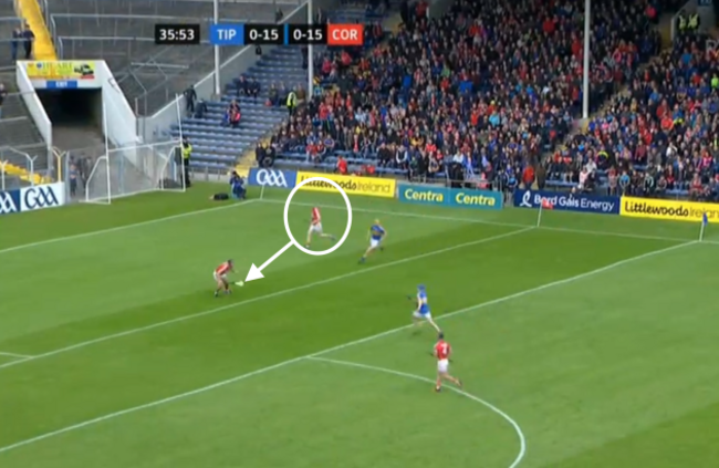 The ball moves on to Darragh Fitzgibbon, with the covering Tipperary player a couple of crucial yards away: