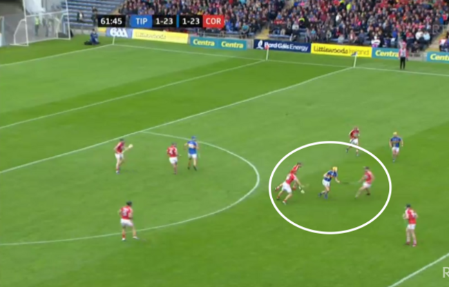 Harnedy’s allowed to gain possession completely unchallenged and while, in the next picture, he has three Tipperary men around him, not one of them is laying a glove on him: