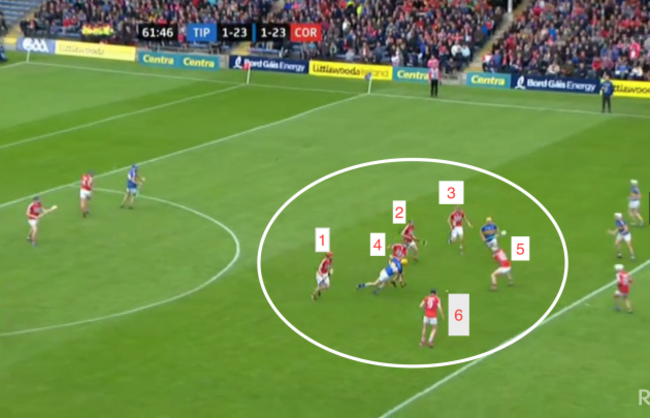 Soon after, look at the positioning of Seamus Harnedy (red circle) and James Barry (blue circle), after Luke Meade drops a ball into space, landing where the arrow is pointed to: