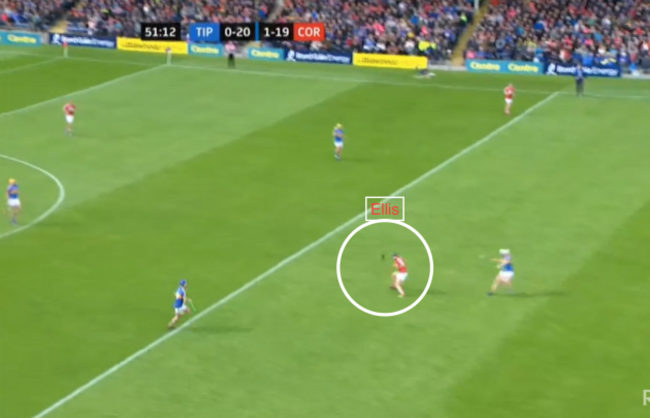 It’s a good ball from Ellis, landed close to the touchline and in many ways, reminiscent of the ball that Cathal Barrett delivered for ‘Bubbles’ in last year’s All-Ireland final, when he found himself one-on-one with Kilkenny’s Paul Murphy: