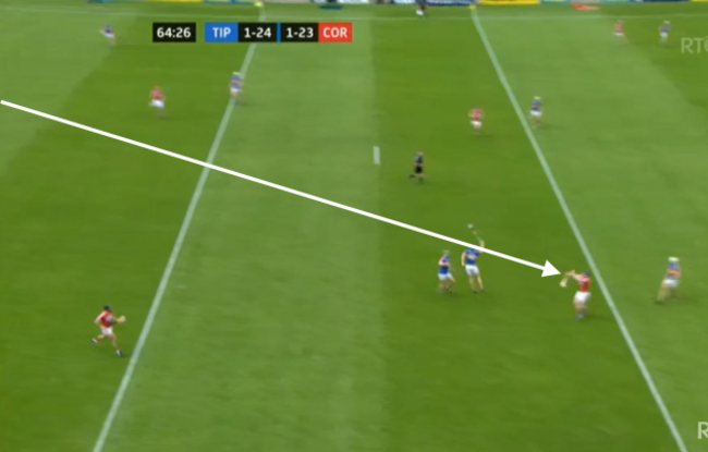 The crossfield pass is to Patrick Horgan, who is on hand to collect, and score a subsequent point: