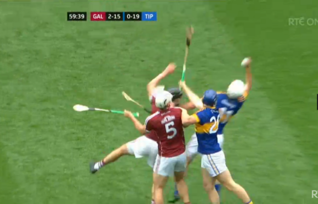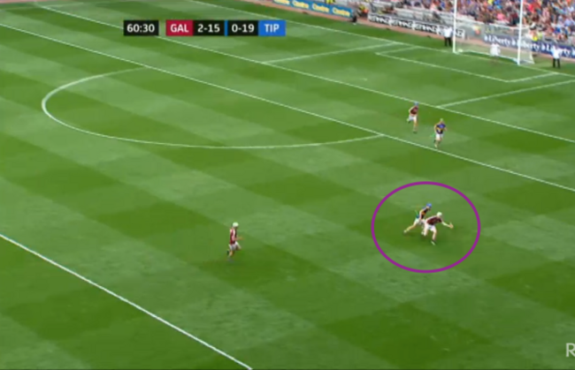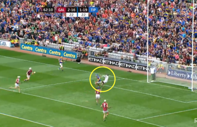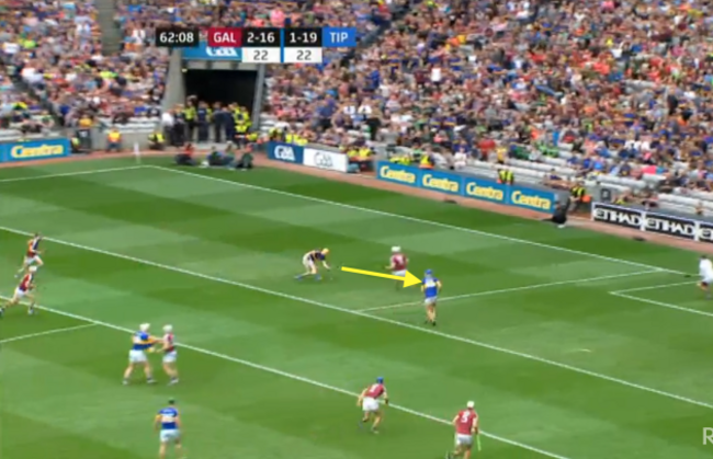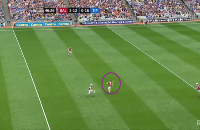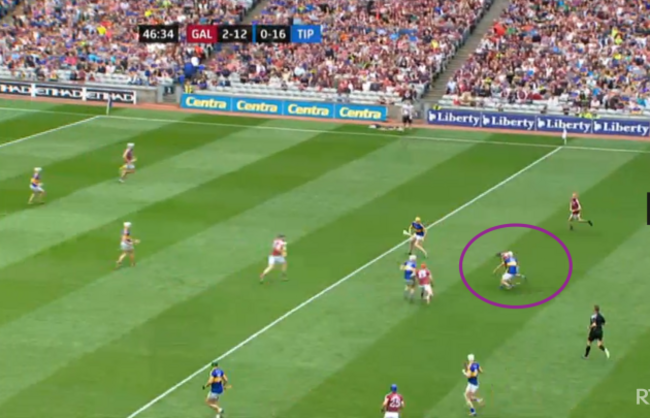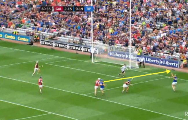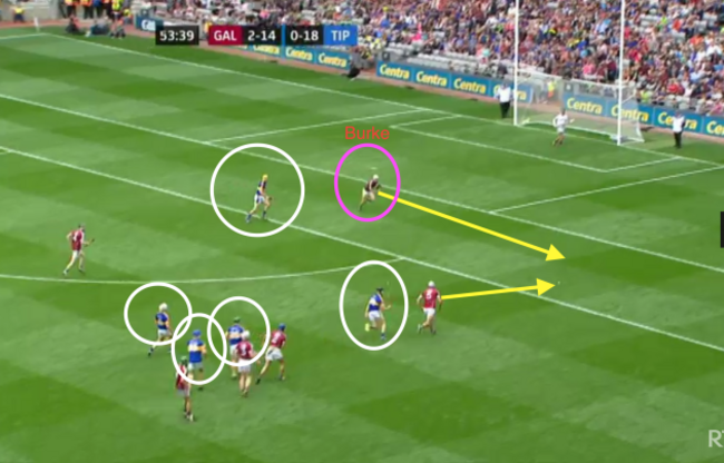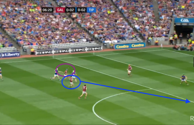 Below is one good example, with just one Tipp forward, Seamus Callanan, anywhere near the 20m line. The Galway defenders, Gearóid McInerney and Daithí Burke, are well positioned to come from two different angles to cover as the ball drops in behind. Eventually, it will be Burke who completes the clearance: