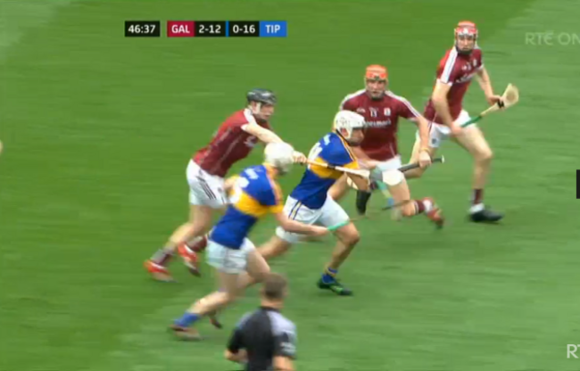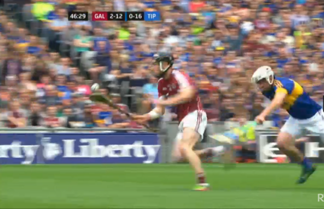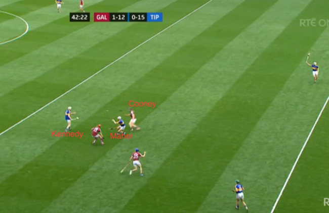 For Galway’s second goal, Seamus Kennedy and Brendan Maher try to play an elaborate one-two of handpasses but goal-scorer Joseph Cooney is alive to it: