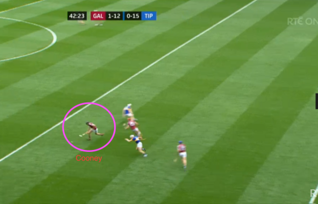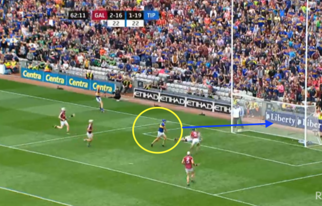 Johnny Coen (purple circle in the next picture) picks up possession and his handpass to goal-scorer Conor Cooney (blue circle) is excellent. But Tipp’s error on the touchline has them badly on the back-foot as Cooney has loads of space to run into and he will eventually get his shot away from the spot where the arrow points to: