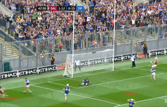 Cooney moves on and crashes a shot into the far corner and Brendan Maher, with hands on head, knows that he’s made a mistake: