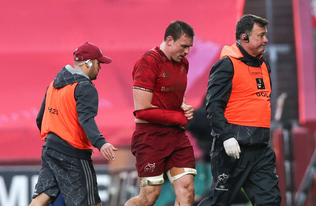 Tommy O’Donnell departed the field in a makeshift sling early in the second half after helping Munster force their way into the lead with Robin Copeland’s try.