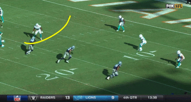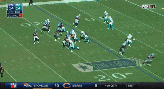 With Dez Bryant lined up to the inside — rather than his traditional role outside the numbers — the Dolphins have a decision take. They can use their spare man Jones to shift over the Bryant’s side of the field and provide help.