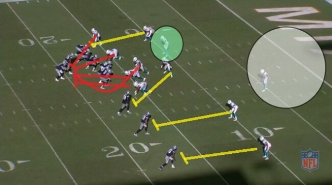 Miami are playing Cover 1 which involves a singles free safety — in this case Walt Aikens (white) — defending a deep zone in the middle of the field, five players blitzing the quarterback and four defensive backs in man-to-man coverage.