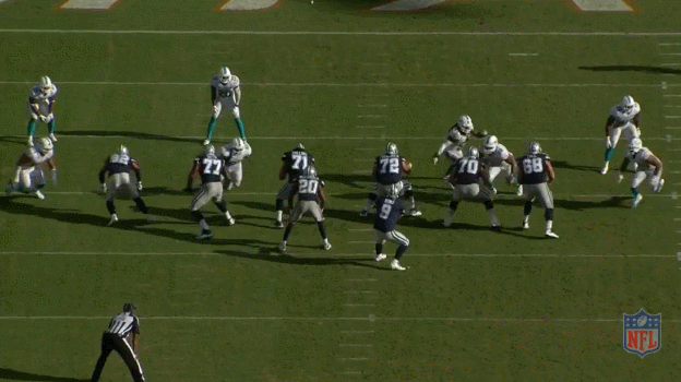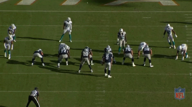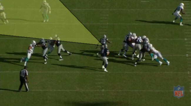 The remaining ‘free’ player can be used to rush the quarterback, play zone or ‘spy’ Romo for any potential quarterback runs. In this case, strong safety Reshad Jones (green) drops into shallow zone coverage.