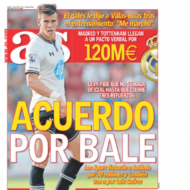 Tottenham want Suarez: According to the AS front page, Spurs will make an audacious bid for the Liverpool frontman as they prepare to part with Gareth Bale. Captain Hook is skeptical though.