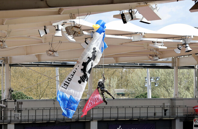 The closing match of the weekend in Toulouse was delayed by 40 minutes when an air force parachutist, who was supposed to bring the match ball onto the pitch, was caught on the roof of the stadium.