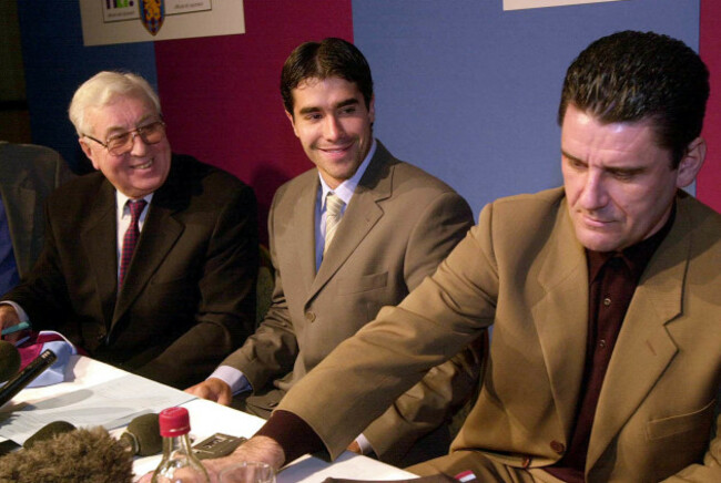 Aston Villa chairman Doug Ellis (left), Juan Pablo Angel and manager John Gregory. PA Archive / Press Association Images
