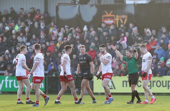 Referee David Gough issued five red cards after the sides engaged in a major scuffle, with four Tyrone players being sent to the line. Hampsey was one of the players who was punished, along with Kieran McGeary, Michael McKernan and Peter Harte.