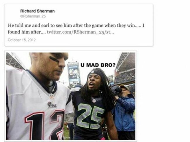 The trash talking didn’t stop here. After the game, Sherman took to Twitter, and sent out a meme-ified version of this photo with text reading “U MAD BRO?” over it. He has since deleted this tweet, but replaced it with another photo of Brady looking sad (via Big Lead Sports):