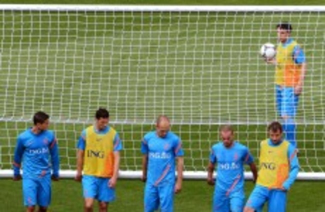 Mark van Bommel looks on as his Dutch teammates move the posts to the other side of the pitch to avoid chanting. Geert Vanden Wijngaert/AP/Press Association Images