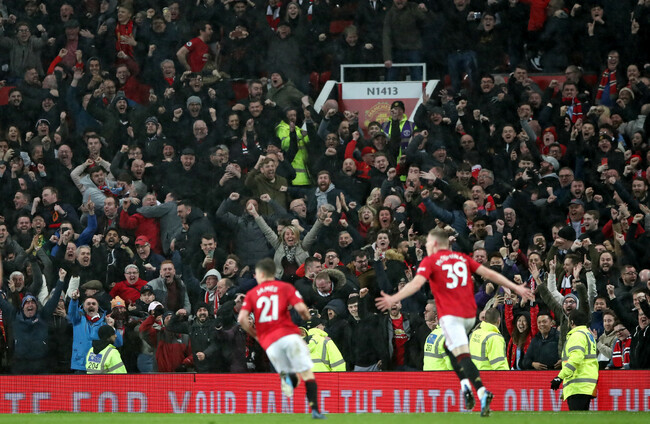 Manchester United's Scott McTominay celebrating his goal against Manchester City during the last fixture at Old Trafford to be played in front of a capacity crowd, on 8 March 2020. Nick Potts
