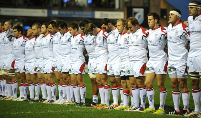 Ulster players during the minute silence, prior to the victory over Cardiff, in memory Nevin Spence. (©INPHO/Huw Evans)