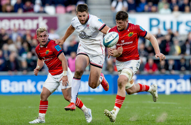Ulster’s Matty Rea with Jean Kleyn of Munster. Morgan Treacy / INPHO
