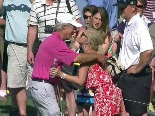 Julie Crenshaw gave her husband Ben a smooch after he hit a hole in one at the Par 3 Contest