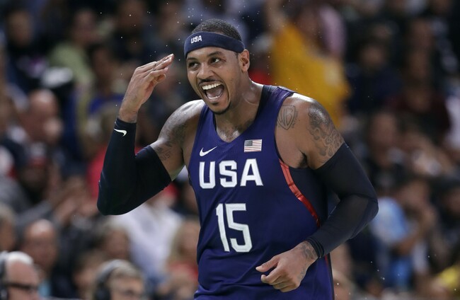 United States' Carmelo Anthony (15) celebrates after making a three-point basket during a basketball game against Australia at the 2016 Summer Olympics. Charlie Neibergall