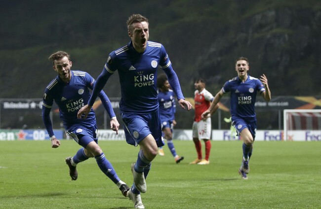 JAMIE VARDY STRUCK deep into stoppage time to send Leicester City through to the last 32 of the Europa League with a thrilling 3-3 draw against Braga in Portugal.