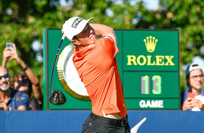 Hovland was in danger of squandering a two-shot lead on the final hole when he pulled his second shot from an awkward lie on the edge of a bunker into the water, but the Ryder Cup star got up and down to salvage an unlikely bogey.