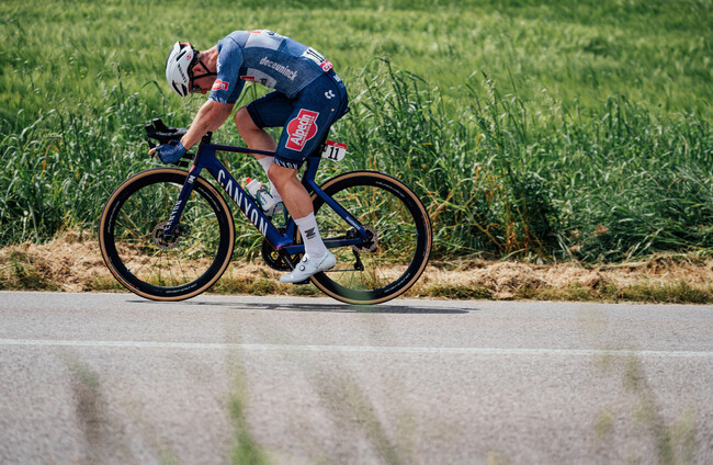 Visma’s Van Aert takes the general classification lead after earning six bonus seconds for placing second.
