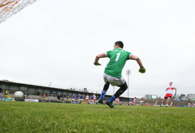 7. Cavan goalkeeper Raymond Galligan can only look on as Derry’s Ryan Bell converts from the spot