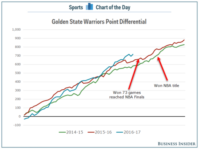 Last season, the Warriors didn’t reach +718 point differential until Game 66 and had an average winning margin of 10.8 points per game.