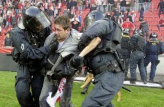 The fans dispersed following pleas from the players that the game be allowed to begin, but returned to the pitch at the break with riot police deployed to prevent them from following club director Miroslav Platil down the tunnel.