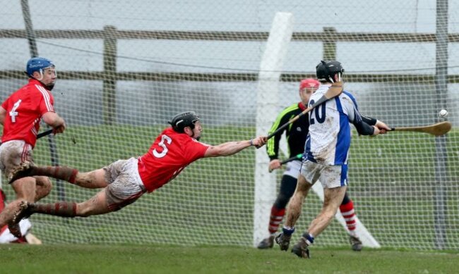 Cork’s Stephen White dives to challenge Waterford’s Jamie Barron.