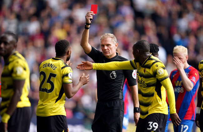 Watford'’s Hassane Kamara receiving a red card. PA