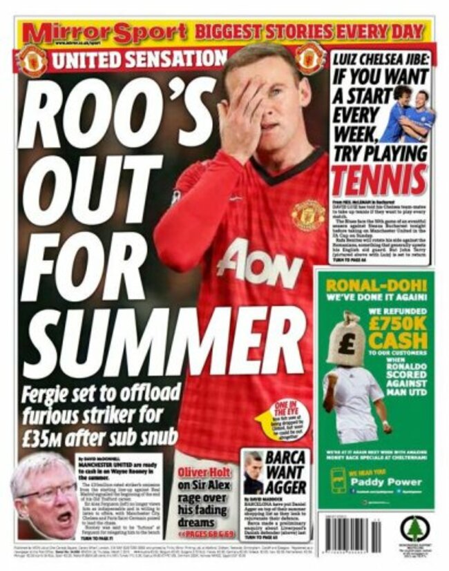 Wayne Rooney's heading out the door at Old Trafford according to tomorrow's Daily Mirror