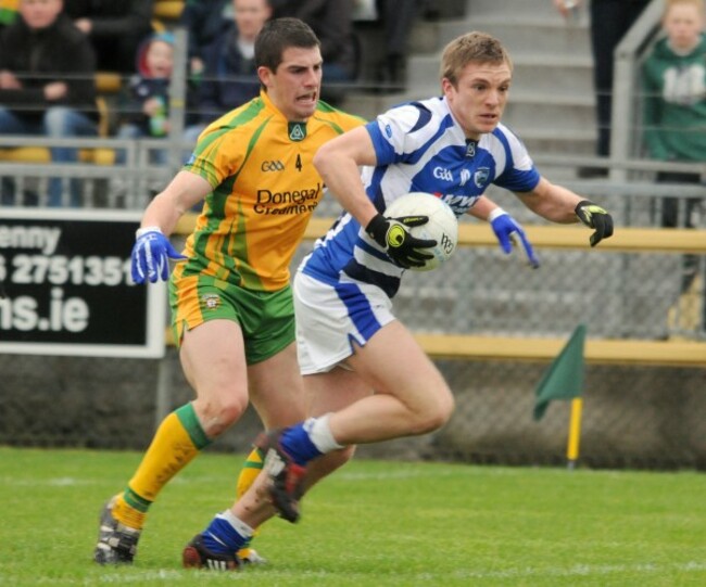 Paddy McGrath (Donegal) and Ross Munnelly (Laois). INPHO/Kieran Murray